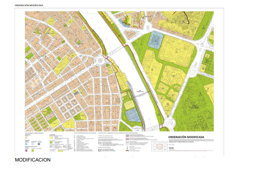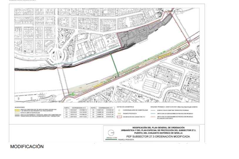 Según la descripción oficial, la presente Modificación tiene por finalidad última viabilizar (sic) la construcción de una pasarela peatonal entre ambas márgenes de la dársena del Guadalquivir, localizada entre los puentes de San Telmo y Los Remedios.