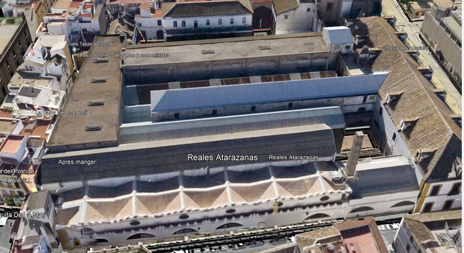 La siguiente imagen del satélite de Google es la más reciente de las Atarazanas y muestra los cambios que ha sufrido tras la intervención de Guillermo Vázquez Consuegra, especialmente la elevación de la cubierta de la segunda nave paralela a la calle Dos de Mayo, una elevación que según fuentes oficiosas próximas al estudio del arquitecto ha tenido como finalidad igualar su altura a la de las restantes naves que se conservan.