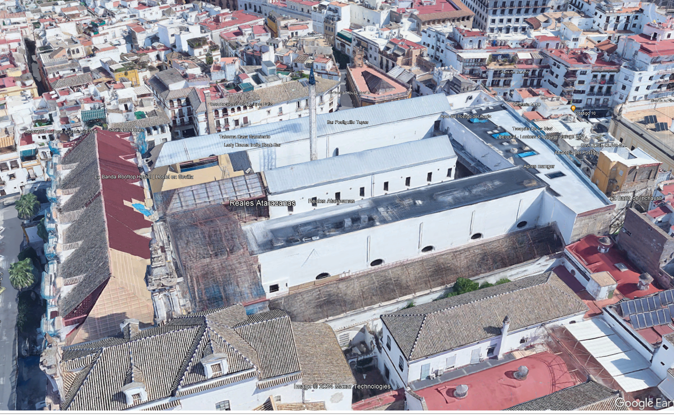 Se observa cómo la nave no sólo ha sido recrecida en altura, sino también en longitud, para prolongarla hasta la de la calle Temprado, cuyas cubiertas están aparentemente siendo impermeabilizadas (color rojizo). En la parte inferior de la imagen se aprecian los arcos de la fachada a la calle Dos de Mayo ya completamente descubiertos.