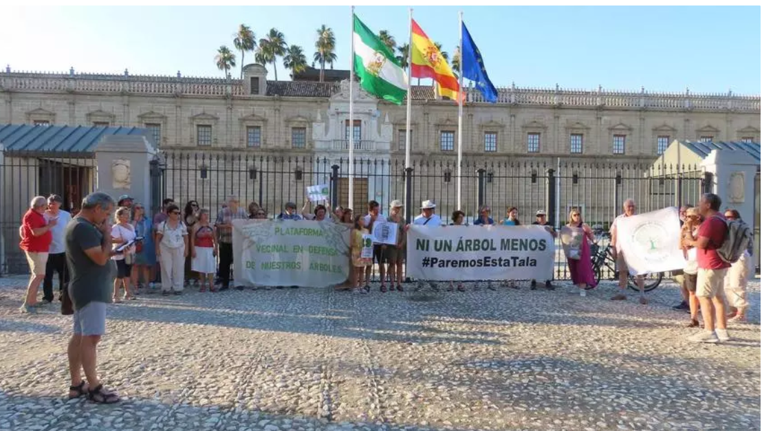 Convocados por la Mesa Ciudadana del Árbol de Sevilla (Mecuidas), representantes de varias asociaciones ecologistas y vecinales de Sevilla se concentraron el pasado mes de julio para protestar contra la tala de dos grandes árboles en el jardín exterior del Parlamento de Andalucía: un ficus y una tipuana.