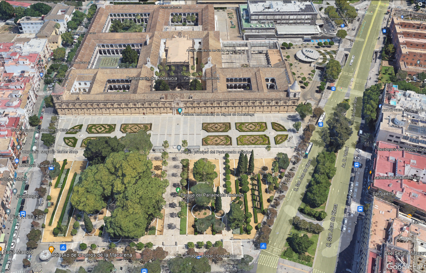 Vista aérea del Parlamento de Andalucía y de sus jardines
