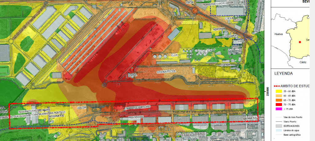 El mapa refleja la intensidad del ruido en el puerto de Sevilla durante la noche, con 75 decibelios en la zona de concesiones cementeras (Cimsa y Portland), en color rojo