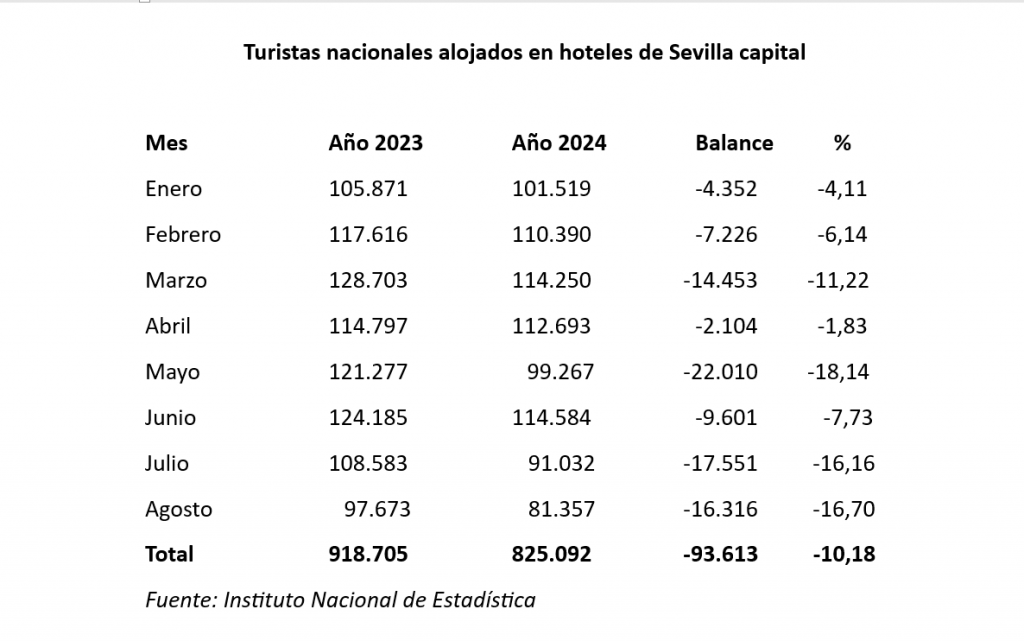 A lo largo del año 2024, los hoteles de Sevilla capital han perdido cerca de cien mil clientes españoles, uno de cada diez de los que se registraron en los ocho primeros meses del año anterior.