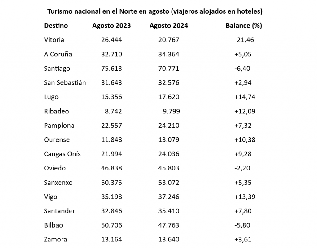 Sólo en Vitoria, Santiago de Compostela, Oviedo y Bilbao ha habido el pasado mes de agosto menos viajeros españoles alojados que en el mismo mes del año previo, mientras que en los otros once destinos del Norte tomados como referencia ha habido mayor afluencia de turistas nacionales que un año antes.