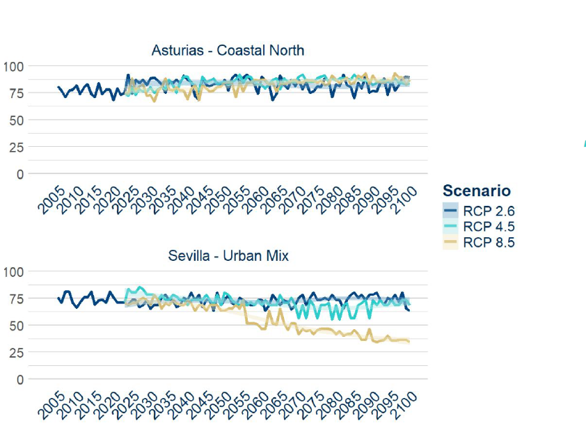 Evolución de la demanda turística en Asturias y Sevilla hasta 2100 en función de escenarios climáticos manteniendo constantes el resto de factores (mes de agosto). Los RCP son cuatro proyecciones de probables futuras concentraciones de gases de efecto invernadero en partes por millón: RCP 2.6; RCP 4.5; RCP 6.0, y RCP 8.5, la de mayor concentración)