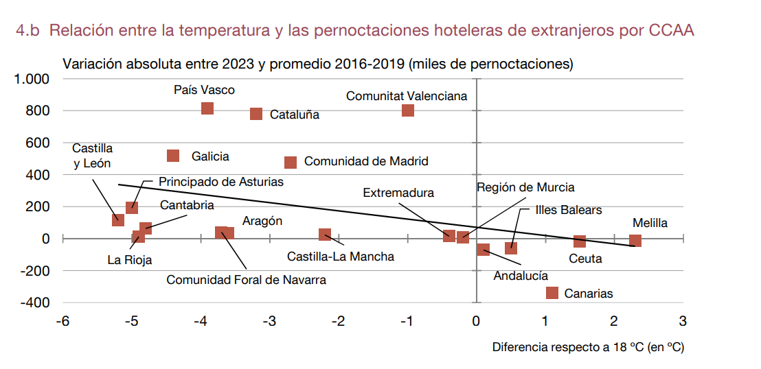 Según el banco supervisor, si bien aún es pronto para extraer conclusiones definitivas, el cambio climático podría estar originando desplazamientos de turistas hacia destinos con temperaturas más moderadas en verano, consecuencia de ello, se reduciría la concentración en las zonas de mayor afluencia en los meses estivales y aumentaría la ocupación de los destinos de playa durante los meses de otoño e invierno.