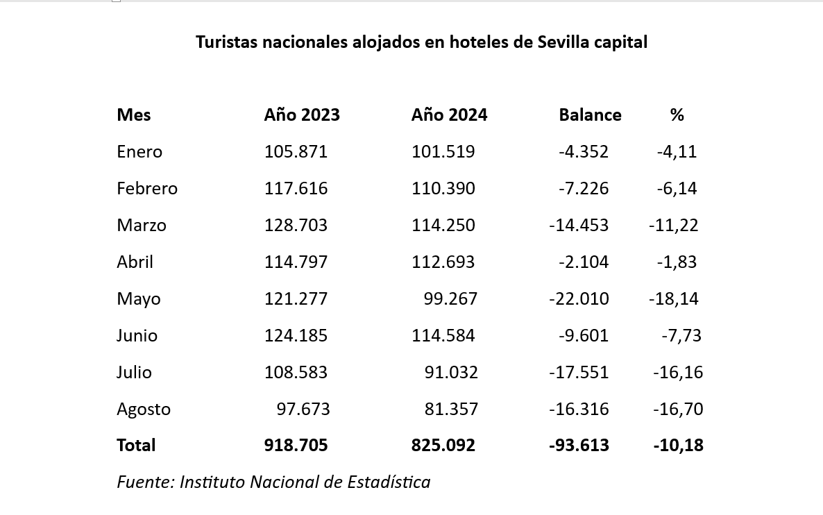 A lo largo del año 2024, los hoteles de Sevilla capital han perdido cerca de cien mil clientes españoles, uno de cada diez de los que se registraron en los ocho primeros meses del año anterior.