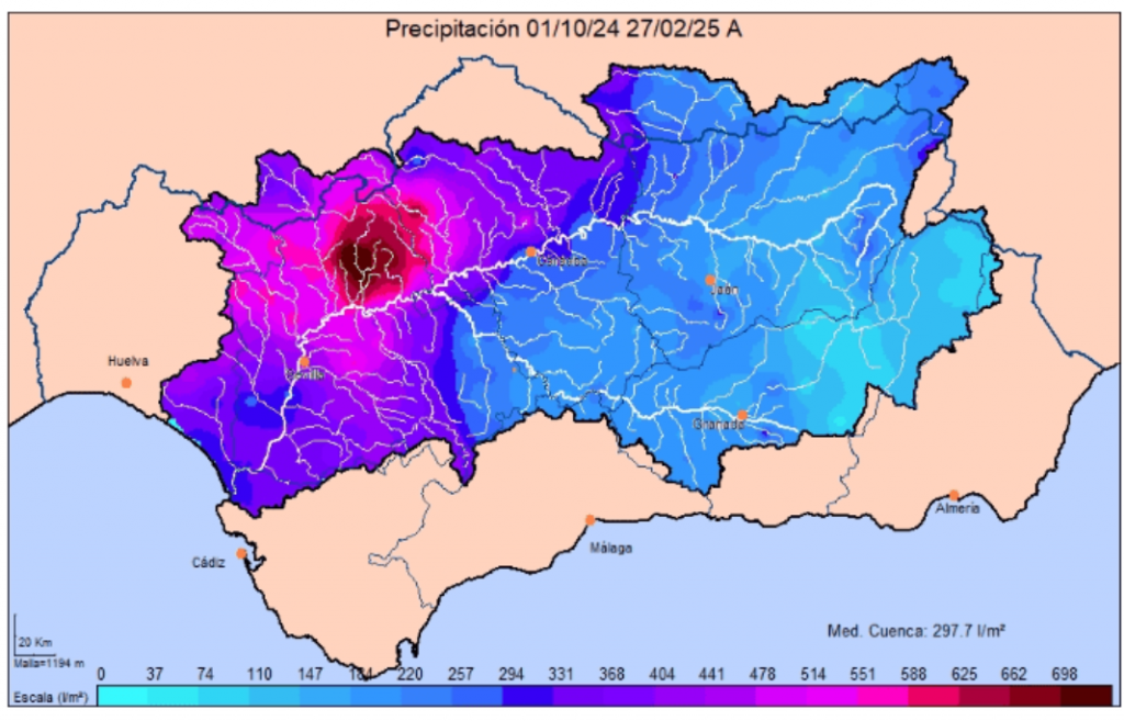 Desde el inicio de la campaña, en octubre, y por lo que hace a la Cuenca del Guadalquivir, la media de lluvias en Sevilla ha sido de 441 l/m2, mientras que en Córdoba, ha sido de 338 l/m2; en Jaén, de 216 l/m2, y en Granada, de 161 l/m2. Ha llovido en Sevilla el doble que en Jaén y el triple que en Granada, y de ahí que algunos embalses de Sevilla hayan tenido que verter agua, mientras la Regulación General no llega apenas a los 1.700 hm3, el 30% de su capacidad.