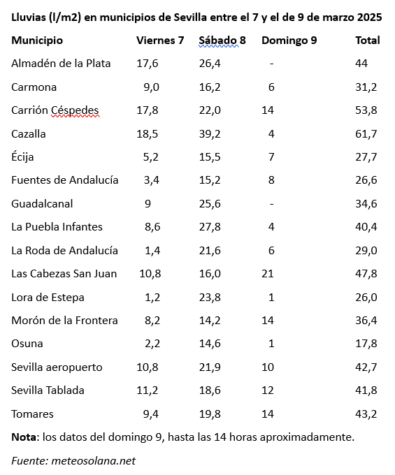 De esta manera, en el fin de semana comprendido entre el viernes 7 y el domingo 9 de marzo en la metrópolis se han registrado unos 42 litros/m2, según el portal meteosolana.net, cantidad sólo superada en la provincia para el mismo periodo cronológico por Cazalla de la Sierra (61,7 litros), Carrión de los Céspedes (53,8), Las Cabezas de San Juan (47,8), Almadén de la Plata (44) y Tomares (43,2).