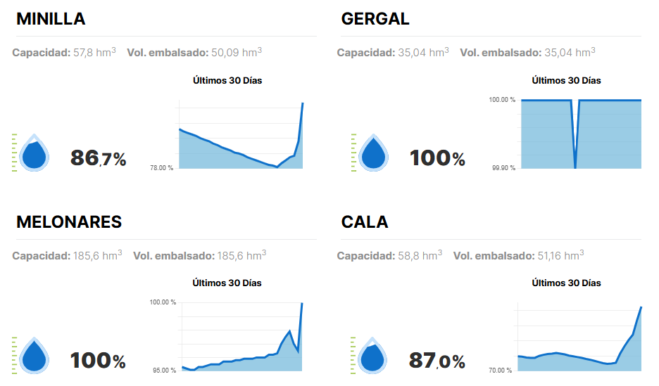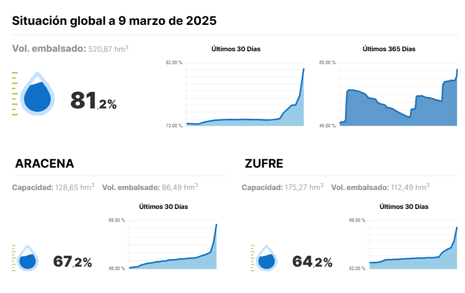 Al inicio de este mes de marzo de 2025 esos pantanos acumulaban 469,933 hm3, cantidad equivalente al 73,2% de su capacidad.