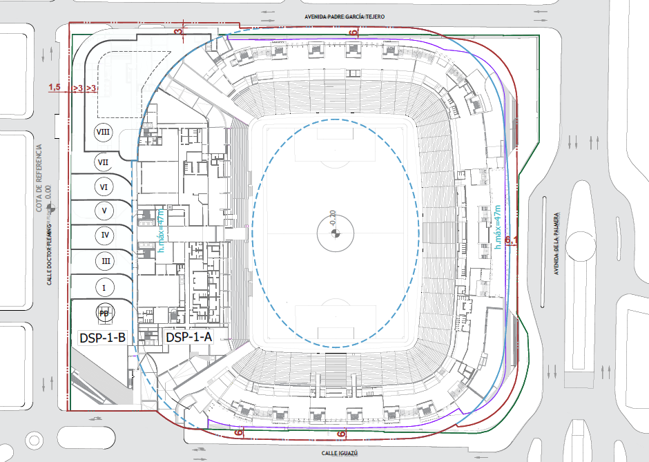 En el estadio (DSP-1A), la altura máxima de la cubierta en el interior no podrá superar los cuarenta y siete metros (47m).