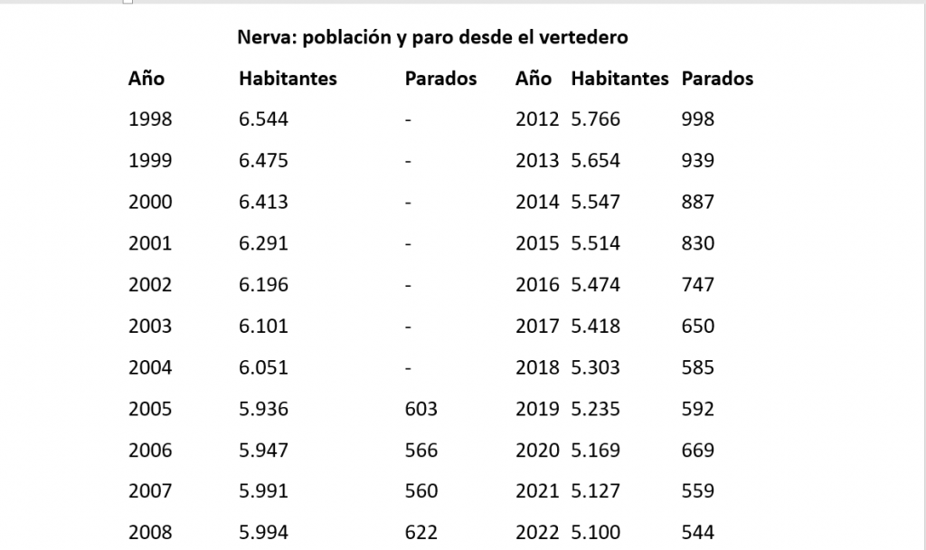 Desde el año 1998 en que entró en servicio el vertedero hasta 2024 Nerva ha perdido 1.471 habitantes, es decir el 22,47% de su población, cifra equivalente a uno de cada cinco. Ha pasado de 6.544 vecinos a 5.073.