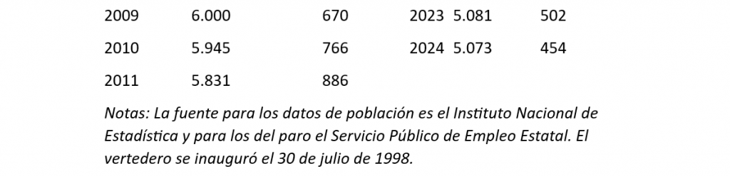 Vamos a ver ahora lo que reflejan las estadísticas oficiales, la referida a población (Instituto Nacional de Estadística), y la referida al paro (Servicio Público de Empleo Estatal), a diciembre de cada año desde el que se inauguró el vertedero de residuos industriales, hecho que acaeció el 30 de julio de 1998. En la serie histórica del paro no hay datos anteriores al año 2005 porque este fue justamente en el que se inició el nuevo sistema unificado por parte de todos los organismos implicados, desde el Gobierno central a las comunidades autónomas.