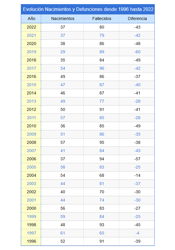 En el siguiente cuadro de Foro Ciudad se aprecia cómo desde la creación del vertedero -y antes, todo sea dicho- sistemáticamente mueren más vecinos en Nerva de los que nacen: