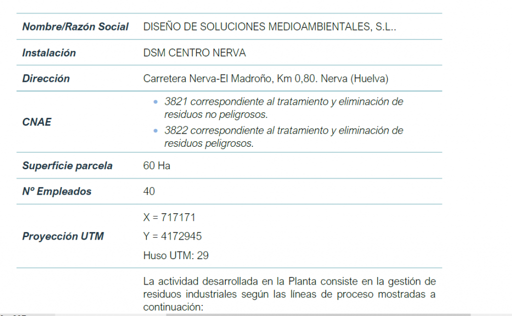 La empresa gestora del vertedero de residuos industriales de Nerva, Diseño de Soluciones Medioambientales (DSM), afirma en su solicitud a la Junta de Andalucía de modificación sustancial de la Autorización Ambiental Integrada del mismo que su nuevo proyecto -implicaría la construcción de diversas plantas de tratamiento de residuos sólidos y líquidos- supondría un beneficio para la economía local.