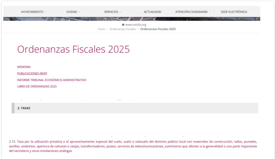 Es lo mismo que aparece cuando se busca la Ordenanza no a través de la Gerencia de Urbanismo, sino de la Agencia Tributaria del Ayuntamiento de Sevilla, por la lista de Ordenanzas Fiscales vigentes en 2025: https://www.sevilla.org/servicios/agencia-tributaria-de-sevilla/ordenanzas-fiscales/ordenanzas_2025