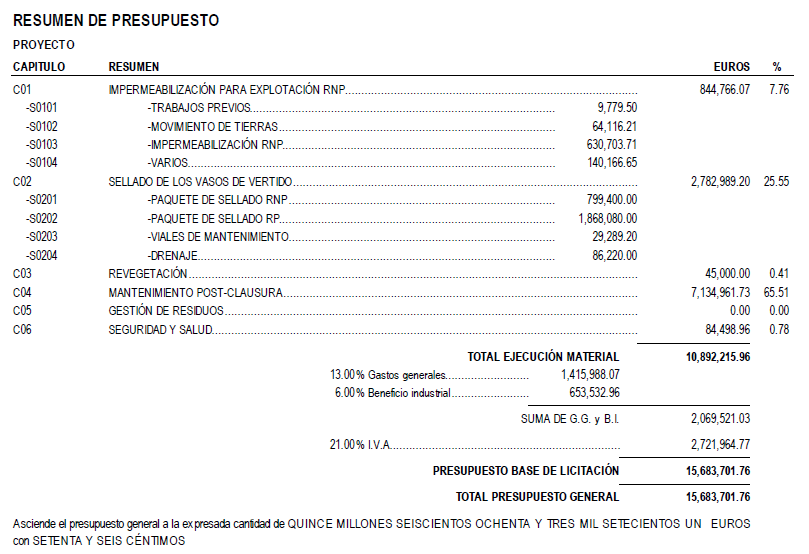 En realidad, la ejecución material de la clausura del vertedero costaría 10.892.215 euros, cantidad que se incrementaría en casi cinco millones (concretamente en 4.791.486 euros) por la aplicación de partidas como gastos generales, beneficio industrial e impuesto sobre el valor añadido o IVA.