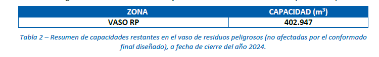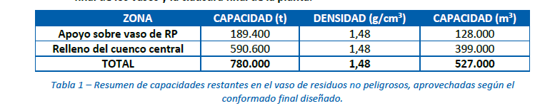 -La explotación del vaso de residuos no peligrosos se realiza en los vasos II y III, encontrándose el vaso I sellado y clausurado. Actualmente los vasos de residuos peligrosos no se explotan, ya que se ha alcanzado una capacidad suficiente para replantear las fases finales de explotación de los mismos (no habiéndose alcanzado aún la capacidad autorizada).