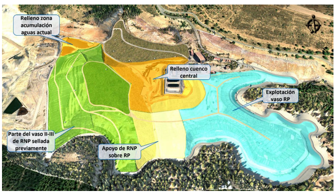 se realizará el apoyo de la masa de RNP (no peligrosos) sobre la masa de RP (residuos peligrosos) para lograr la unificación del conjunto en esta parte (eliminando así la línea de flujo de agua que queda entre ambos vasos, precisamente sobre el dique de residuos peligrosos).