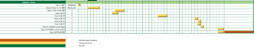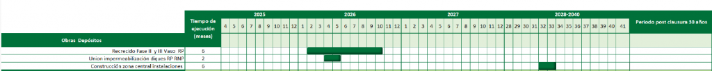 El cronograma de actuaciones para el vertedero de residuos propiamente dicho es el siguiente. Se prevé su clausura en el año 2041.