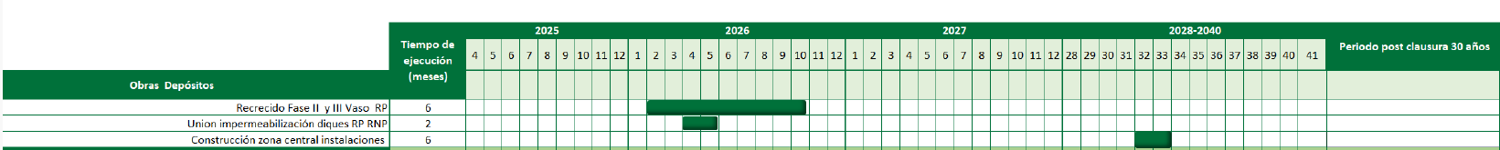 El cronograma de actuaciones para el vertedero de residuos propiamente dicho es el siguiente. Se prevé su clausura en el año 2041.