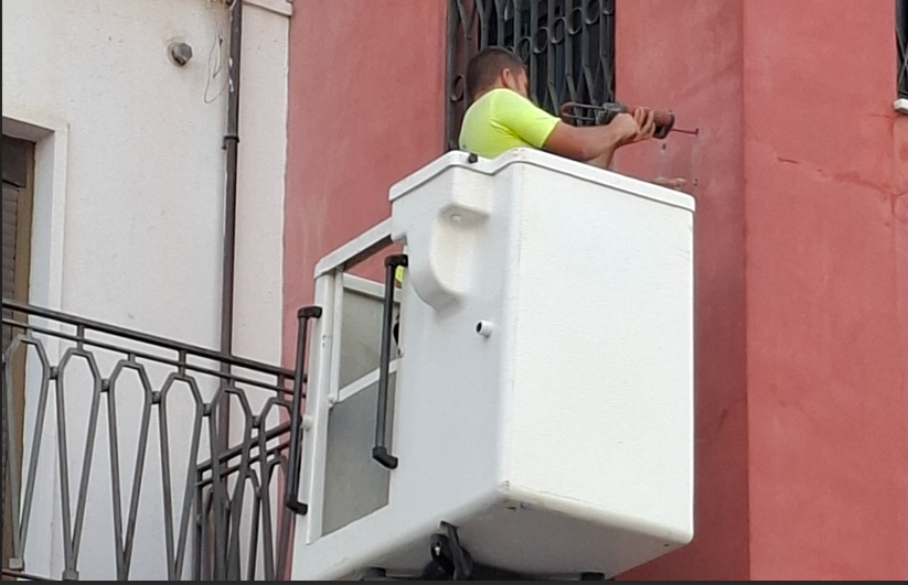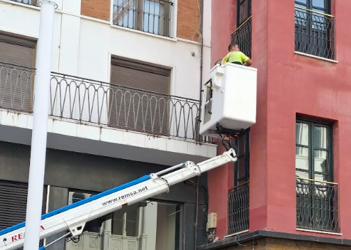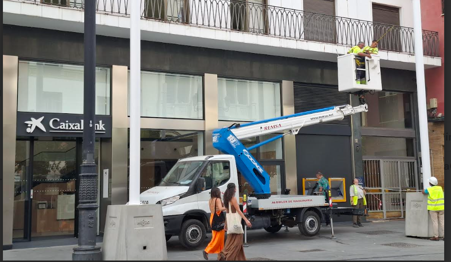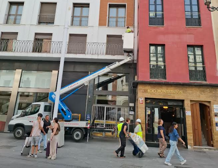 En la acera contraria, en la de los impares, los operarios de la empresa Heliopol, adjudicataria del contrato municipal por valor de 291.974 euros/año durante tres anualidades prorrogables a una cuarta, estaban procediendo a media mañana a la colocación de los anclajes en la fachada retranqueada de la antigua Punta del Diamante, en el número 9, cuya planta baja ocupa un local de la cadena 100 Montaditos.