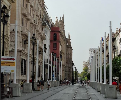 Heliopol, la empresa contratada por el gobierno local de Sevilla, tenía ya instalada durante la mañana del martes 26 de agosto (2025) los anclajes para los toldos del tramo de la Avenida de la Constitución más próximo a las Casas Consistoriales en las fachadas de los edificios de la acera de los números pares y había iniciado la instalación en los inmuebles de la acera de los números impares.