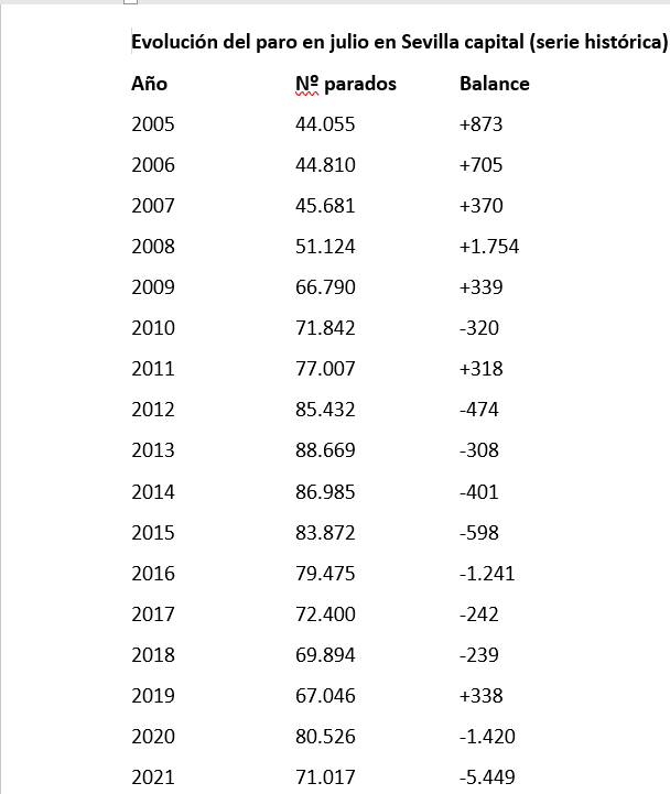 Las reducciones en el número de parados en este mes ya de pleno verano y el últimamente más caluroso en Sevilla también han sido llamativas, pero en este sentido con mayor lógica. Fue el caso de julio de 2121, saliendo ya de los efectos del coronavirus, cuando se registraron 5.449 parados menos en la ciudad.