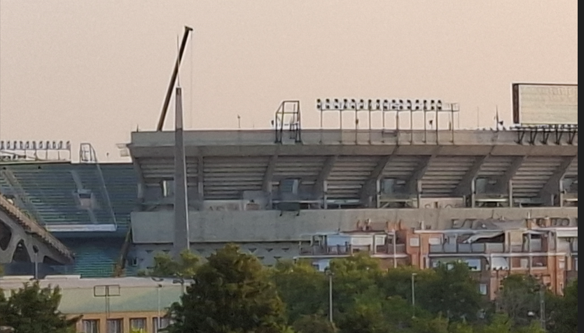 Una grúa de grandes dimensiones está siendo movida desde primera hora de la mañana de este lunes 11 de agosto (2025) en el interior del estadio del Betis, junto a la explanada de propiedad municipal situada entre el Benito Villamarín y la calle Doctor Fleming, del barrio de Heliópolis, que fue totalmente vallada entre finales de julio y principios del mes de agosto.