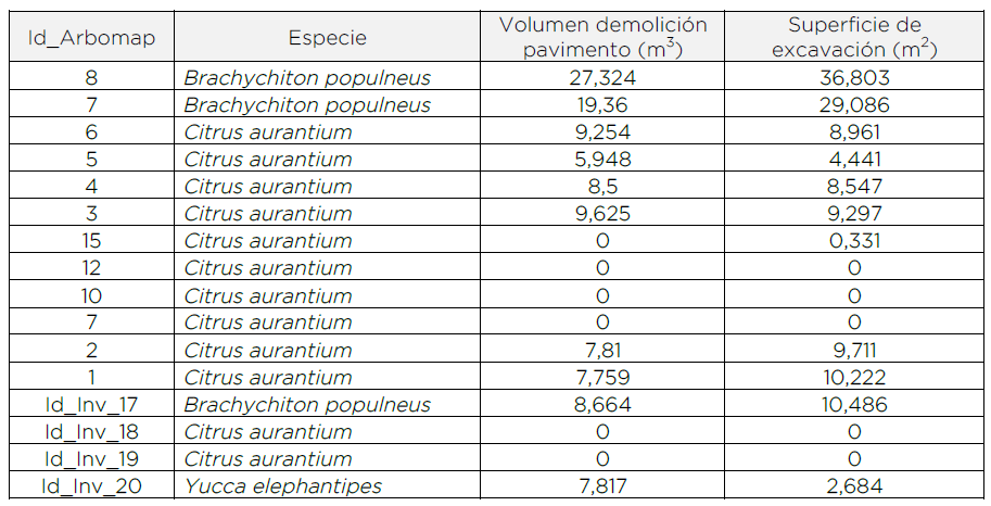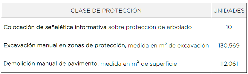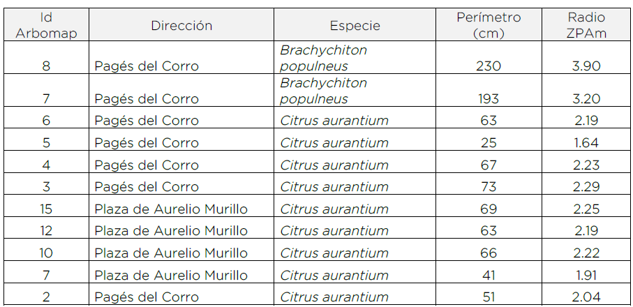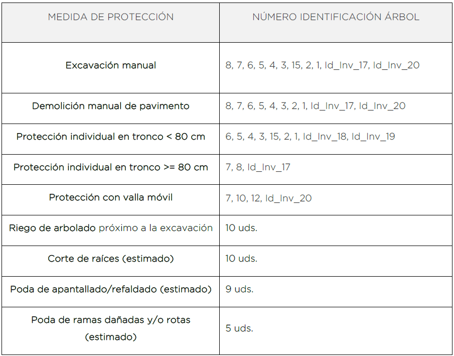 consideradas en la determinación de las medidas de protección. La siguiente tabla recoge las posiciones arboladas consideradas en el estudio y sus zonas de protección radicular: