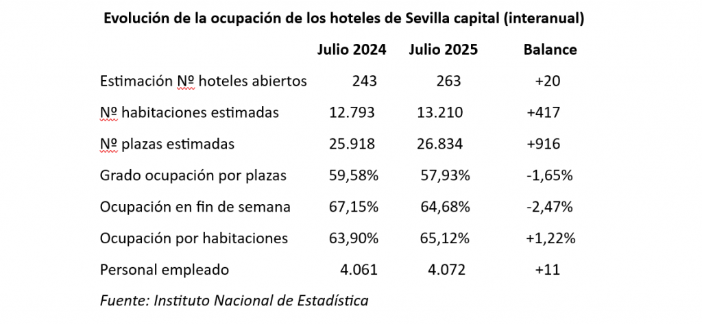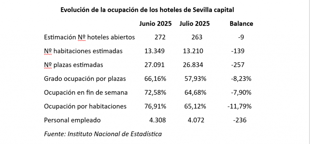 Los hoteleros sevillanos no han podido mantener abiertos en julio de 2025 el mismo numero de establecimientos que en junio debido a la caída tanto del número de viajeros alojados como de las pernoctaciones de un mes para otro, como refleja la Encuesta de Ocupación Hotelera del Instituto Nacional de Estadística (INE).