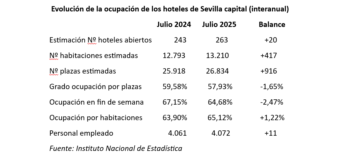 Los hoteleros sevillanos no han podido mantener abiertos en julio de 2025 el mismo numero de establecimientos que en junio debido a la caída tanto del número de viajeros alojados como de las pernoctaciones de un mes para otro, como refleja la Encuesta de Ocupación Hotelera del Instituto Nacional de Estadística (INE).