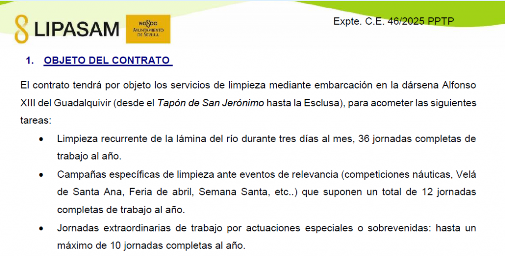 La Comisión Ejecutiva de la empresa Limpieza Pública y Protección Ambiental Sociedad Anónima Municipal (Lipasam), propiedad al 100% del Ayuntamiento de Sevilla, ha licitado el servicio de limpieza mediante embarcación en la dársena del rio Guadalquivir. La haría una compañía externa. Esta externalización, que el gobierno local trata de justificar por el deterioro irreversible del catamarán operado en los últimos 30 años por Lipasam, incumple la promesa realizada durante la campaña electoral por el alcalde, José Luis Sanz.