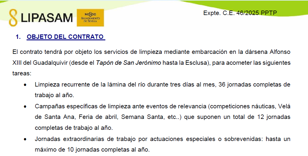 La Comisión Ejecutiva de la empresa Limpieza Pública y Protección Ambiental Sociedad Anónima Municipal (Lipasam), propiedad al 100% del Ayuntamiento de Sevilla, ha licitado el servicio de limpieza mediante embarcación en la dársena del rio Guadalquivir. La haría una compañía externa. Esta externalización, que el gobierno local trata de justificar por el deterioro irreversible del catamarán operado en los últimos 30 años por Lipasam, incumple la promesa realizada durante la campaña electoral por el alcalde, José Luis Sanz.