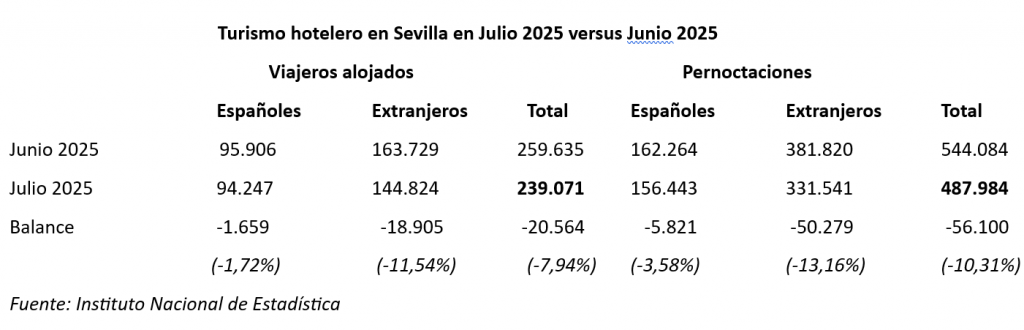 En julio se alojaron en los hoteles de Sevilla capital 18.905 viajeros foráneos menos que en junio (144.824 frente a 163.279). Si al dato se unen los 1.659 viajeros nacionales menos (94.247 frente a 95.906 del mes previo), el balance en este sentido es de -20.564 (un 7,94% menos).