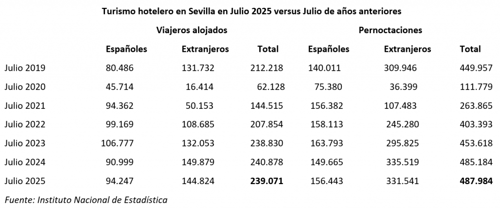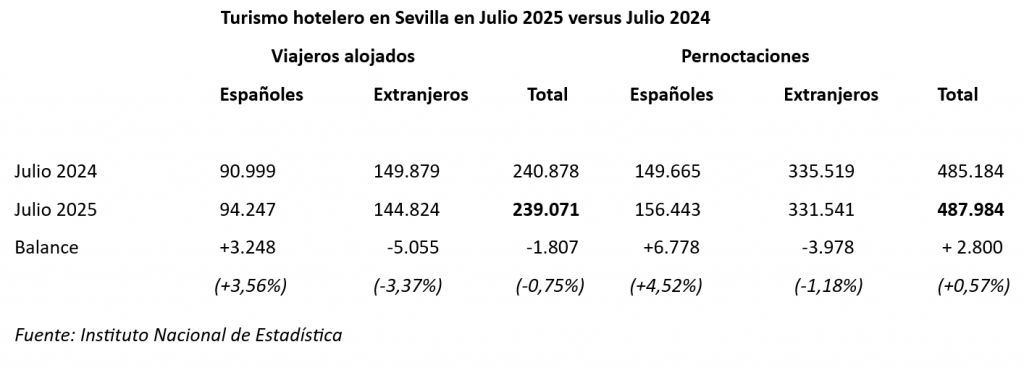 La Encuesta de Ocupación Hotelera del Instituto Nacional de Estadística (INE) muestra que julio de este año 2025 se ha convertido en el segundo mes consecutivo de caída del turismo hotelero en Sevilla capital, ya que se han registrado menos viajeros nacionales y extranjeros y menos pernoctaciones en los establecimientos por parte de ambos grupos de visitantes.
