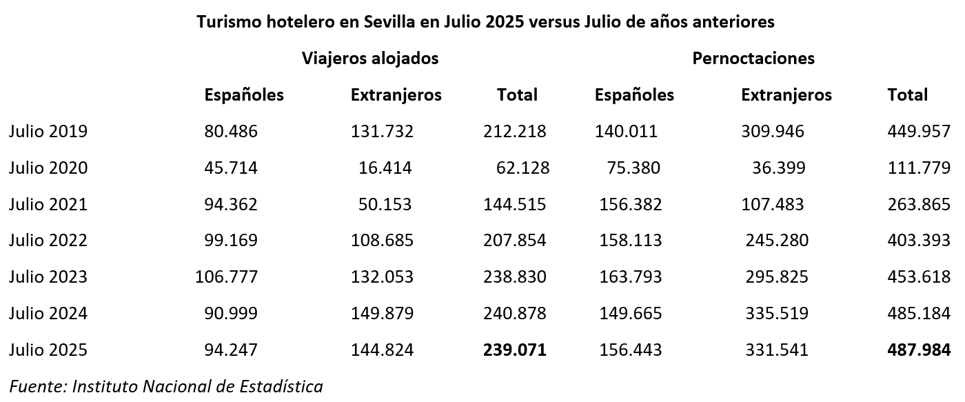 La Encuesta de Ocupación Hotelera del Instituto Nacional de Estadística (INE) muestra que julio de este año 2025 se ha convertido en el segundo mes consecutivo de caída del turismo hotelero en Sevilla capital, ya que se han registrado menos viajeros nacionales y extranjeros y menos pernoctaciones en los establecimientos por parte de ambos grupos de visitantes.