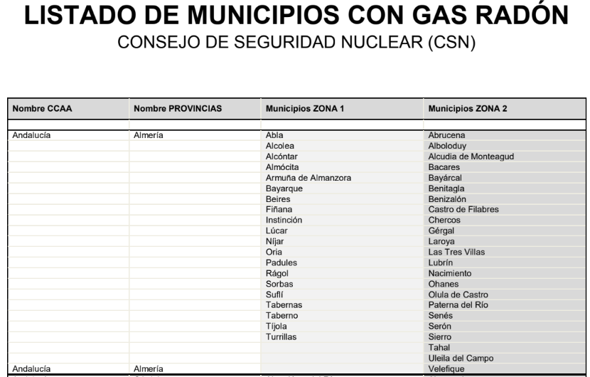 El Consejo de Seguridad Nuclear (CSN) ha aprobado oficialmente el listado de municipios donde será obligatorio medir y controlar la exposición al gas radón en los centros de trabajo. En Andalucía, la medida afecta a 89 de sus 785 municipios —el 11 %— que han sido clasificados como Zona II, es decir, de actuación prioritaria. El gas radón, sin embargo, está presente en una parte significativa del territorio andaluz, con un 30 % del suelo afectado por este riesgo invisible, incluyendo 147 municipios de Zona I, donde también se recomienda su medición aunque no sea obligatoria.