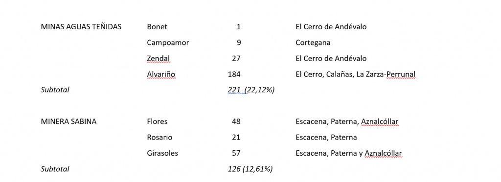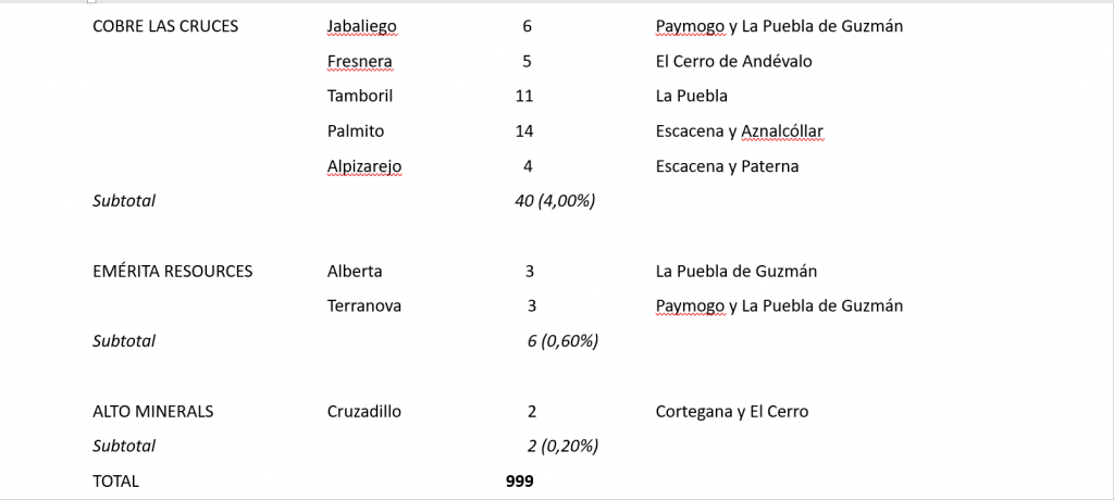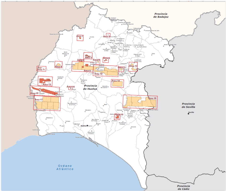 La resolución aprobada el 5 agosto de 2025 por la Junta de Andalucía y publicada en BOJA de 9 y 22 de septiembre, concede permisos de investigación minera en la provincia de Huelva en 30.308 hectáreas, es decir, el 3% del territorio provincial, incluyendo áreas de la Red Natura 2000 y espacios protegidos por el Plan Especial de Protección del Medio Físico de la provincia de Huelva. Las empresas adjudicatarias han sido Alto Minerals, Atalaya Riotinto Minera, Cobre Las Cruces, Emérita Resources España, Minas de Aguas Teñidas y Minera Sabina.