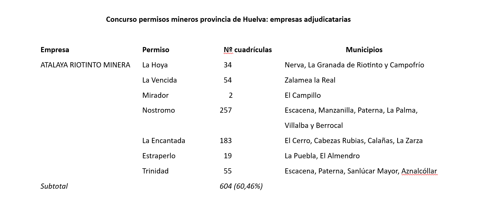 La resolución aprobada el 5 agosto de 2025 por la Junta de Andalucía y publicada en BOJA de 9 y 22 de septiembre, concede permisos de investigación minera en la provincia de Huelva en 30.308 hectáreas, es decir, el 3% del territorio provincial, incluyendo áreas de la Red Natura 2000 y espacios protegidos por el Plan Especial de Protección del Medio Físico de la provincia de Huelva. Las empresas adjudicatarias han sido Alto Minerals, Atalaya Riotinto Minera, Cobre Las Cruces, Emérita Resources España, Minas de Aguas Teñidas y Minera Sabina.