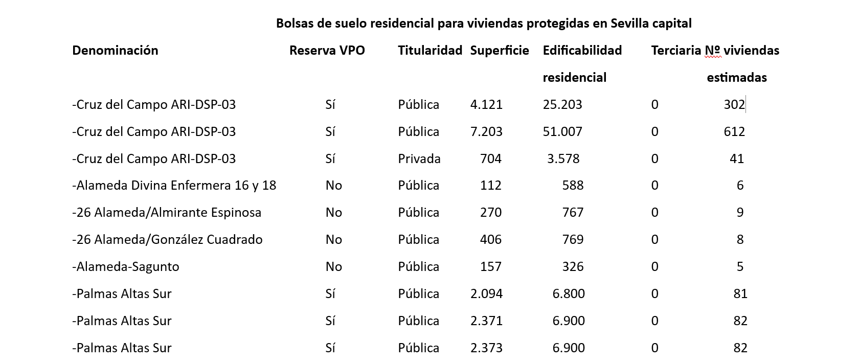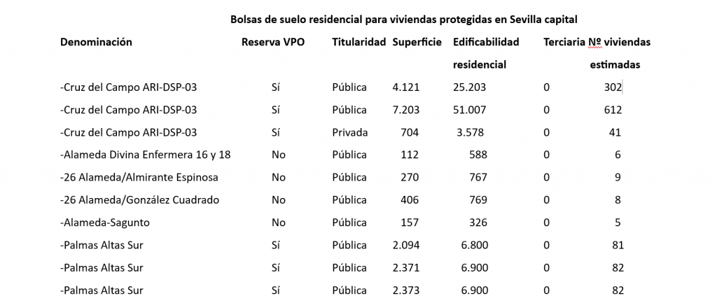 Por municipios, se han localizado parcelas para 1.558 viviendas en Almería, 1.065 en Roquetas de Mar, 252 en Cádiz, 486 en Algeciras, 1.888 en Jerez de la Frontera, 4.225 en Córdoba; 6.314 en Granada, 1.633 en Huelva, 569 en Jaén, 8511 en Málaga, 172 en Marbella, 7.469 en Sevilla y 6.805 en Dos Hermanas.