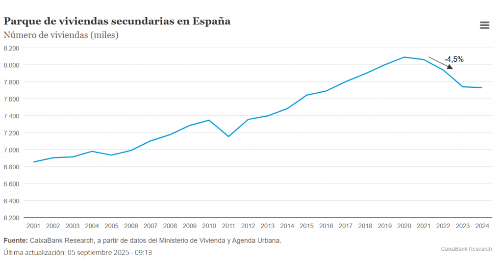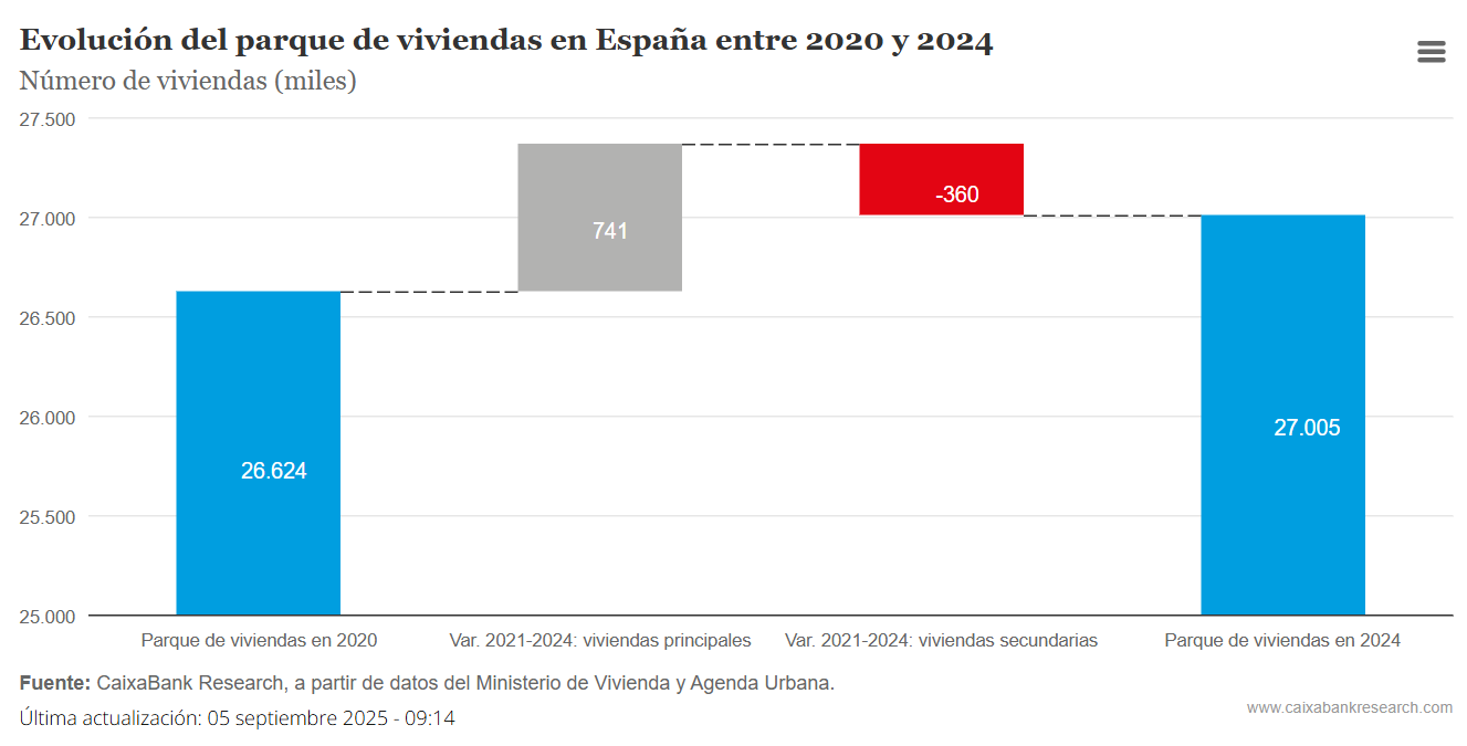 Esto equivale al 4,0% del parque de viviendas principales en 2024 y representa cerca del 80% de los hogares netos creados. Es decir, la nueva vivienda disponible, una vez descontamos el resto de los usos de la vivienda, solamente habría podido alojar a un 20% de los hogares netos creados, y, en consecuencia, el resto de los hogares se alojó en viviendas secundarias reconvertidas en principales.