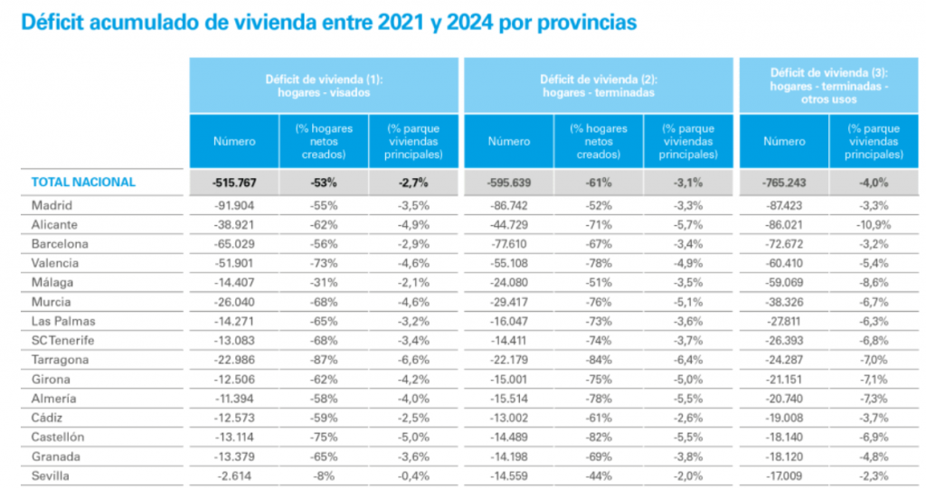 Según la primera estimación, el déficit de vivienda acumulado en cuatro años asciende a unas 515.000 viviendas, cifra que se eleva hasta cerca de 600.000 si se consideran las viviendas terminadas (en lugar de los visados) y que alcanzaría las 765.000 si además se restaran otros usos alternativos de la vivienda.