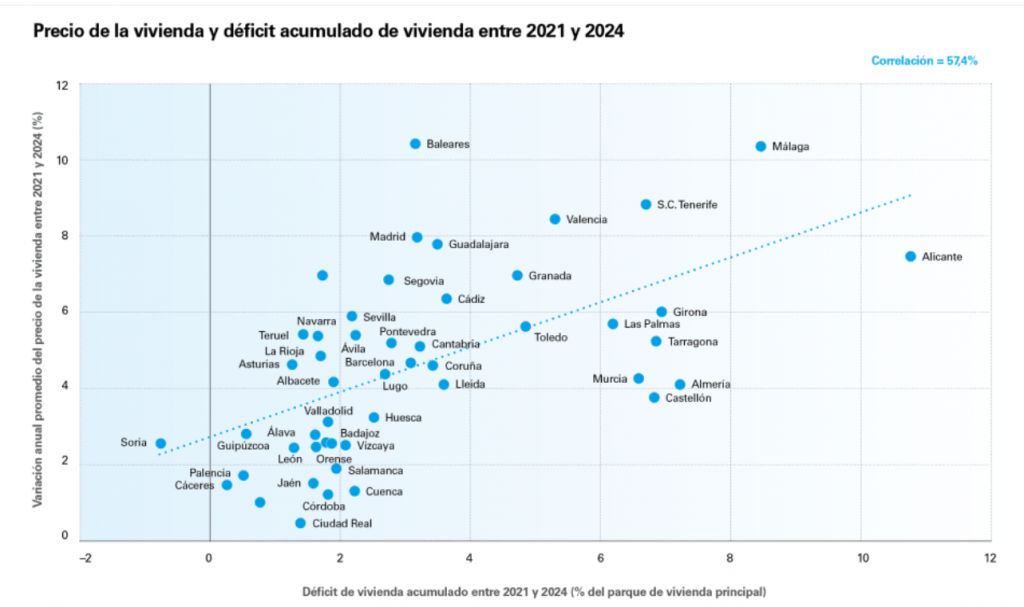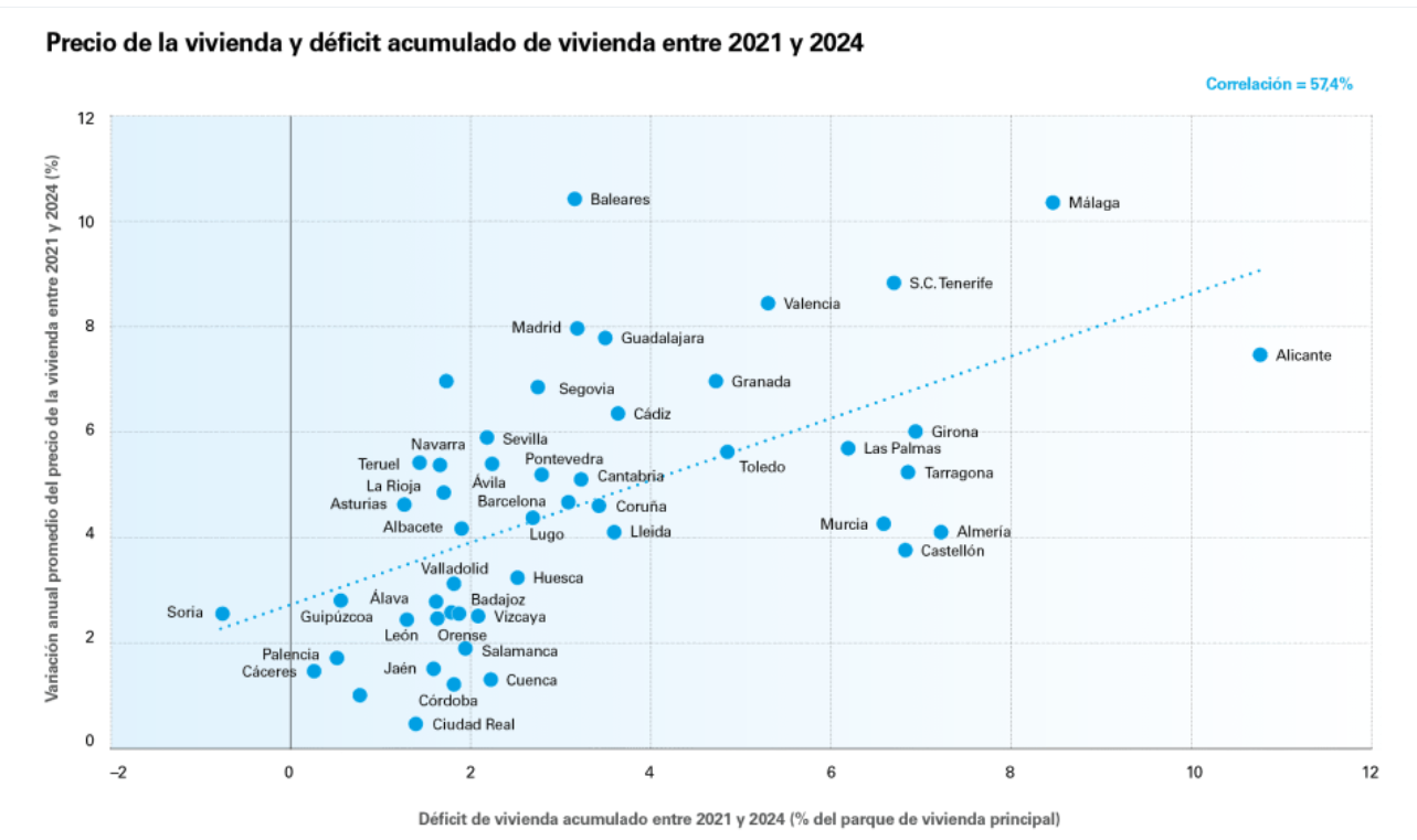 Por provincias, la correlación entre el déficit de vivienda y el crecimiento del precio de la vivienda entre 2021 y 2024 es positiva con todas las medidas (tanto en niveles como en porcentaje del parque de vivienda principal). Este resultado sugiere que el impacto del déficit de vivienda acumulado sobre el precio no es desdeñable.