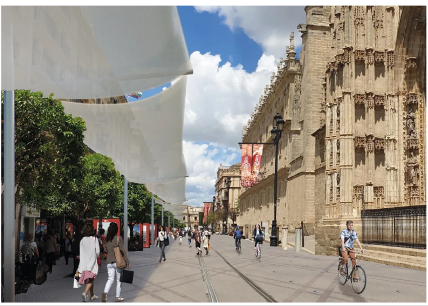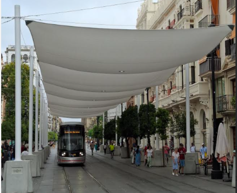 Si a Sanz le gustaban los árboles y ahora asume el error de no haber sembrado más hay que preguntarse por qué nunca pensó en ellos cuando en su proyecto ‘Sevilla Eje Central’, incluido en su programa para las elecciones municipales de mayo de 2023, planteó como solución para proyectar sombra justo en la zona por la que circulan la inmensa mayoría de los viandantes -la acera de los pares, la del edificio de la Adriática, y no sobre las vías del tranvía- toldos sustentados por las farolas fernandinas.