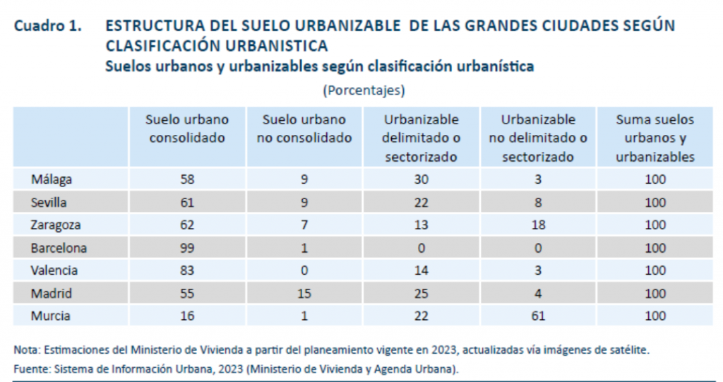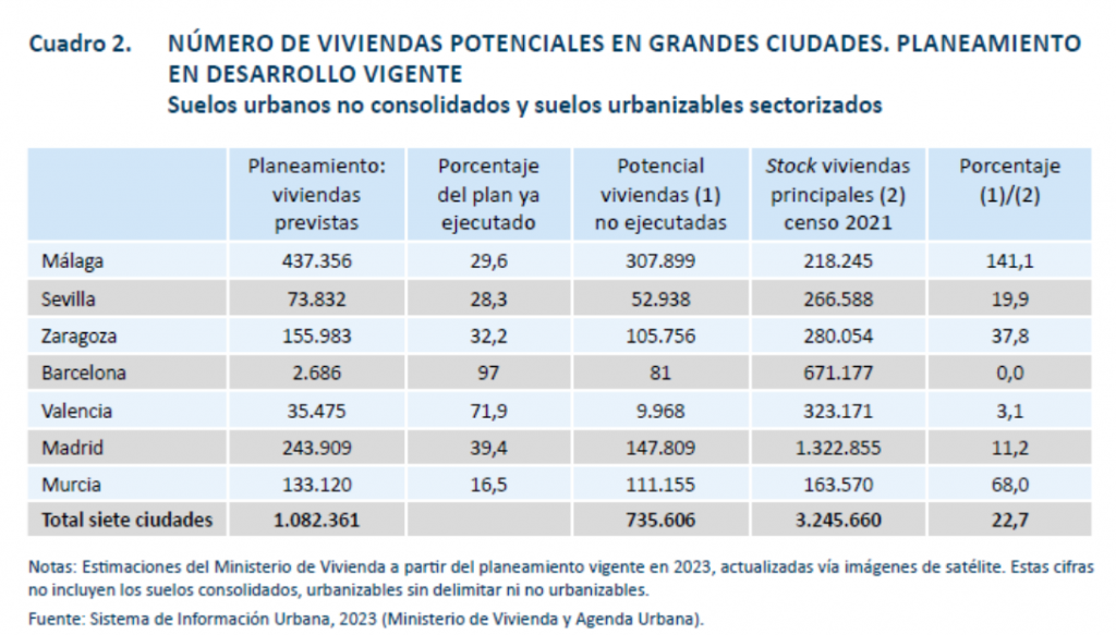 Según las estimaciones del Sistema de Información Urbana (SIU), elaborado por el MiVAU, los suelos en desarrollo –urbanos no consolidados y urbanizables sectorizados– en el planeamiento vigente albergan capacidad para edificar 6,8 millones de viviendas en España. Nótese que esta cifra no incluye los suelos finalistas (urbanos consolidados). Su ejecución supondría ampliar en un 25 % el parque existente. Estos suelos vacantes se distribuyen geográficamente de forma heterogénea. Salvo en algunas ciudades —como Barcelona, que casi ha agotado ya el suelo de esta clase—, son significativos en toda España.