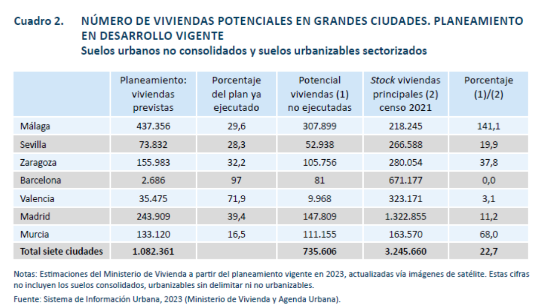 El SIU estima las viviendas potenciales en los municipios del cuadro anterior, de acuerdo con la visión actualizada por satélite del planeamiento vigente. Las diferencias entre ciudades son relevantes, distribuyéndose las 735.606 viviendas potenciales a 2023 de manera muy heterogénea. Desde el excedente masivo de Málaga o Murcia, hasta la escasez de Barcelona.