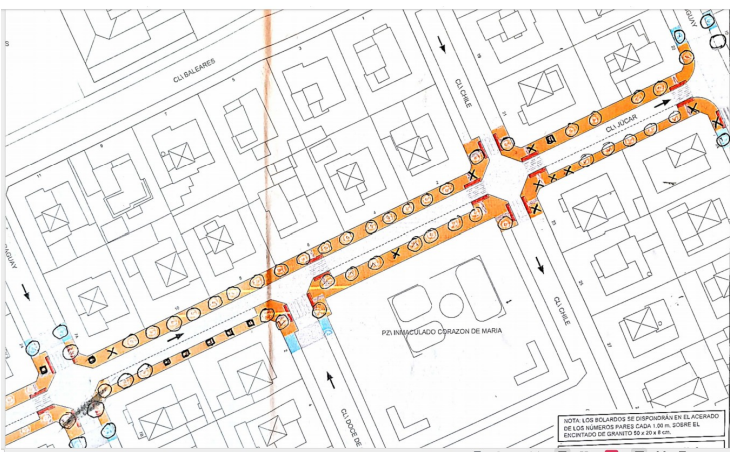 Júcar y con cuadrados, alcorques que se han hormigonado empobreciendo el paisaje de Heliópolis