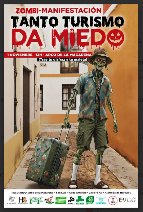Asociaciones vecinales y ecologistas sevillanas han convocado para el próximo sábado 1 de noviembre (2025) lo que denominan, en línea con Halloween, una “zombi-manifestación”, como acción de denuncia ante el impacto negativo del turismo masivo y la especulación con la vivienda. Esta situación, advierten, “está expulsando a la gente de los barrios y convirtiendo la ciudad en un parque temático donde nadie puede vivir”.