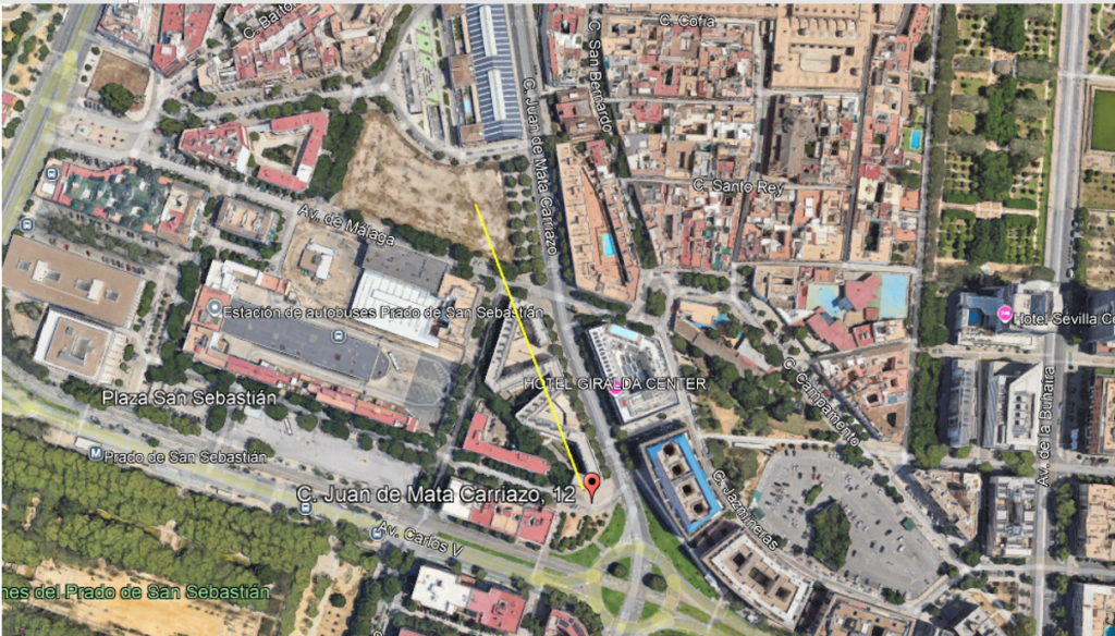 Este estacionamiento, con unas 200 plazas aproximadamente, se halla a poco más de 200 metros de distancia del solar de la Junta de Andalucía. «Nuestro Parking -reza su publicidad comercial- está situado a 5 minutos del Centro de Sevilla en pleno Prado de San Sebastián. Ideal para hacer gestiones en Dependencias Municipales (Hacienda), Juzgados, Registro Civil, Estación de Autobuses o acceder rápidamente andando o en Metrocentro a la zona monumental y comercial de la ciudad»-